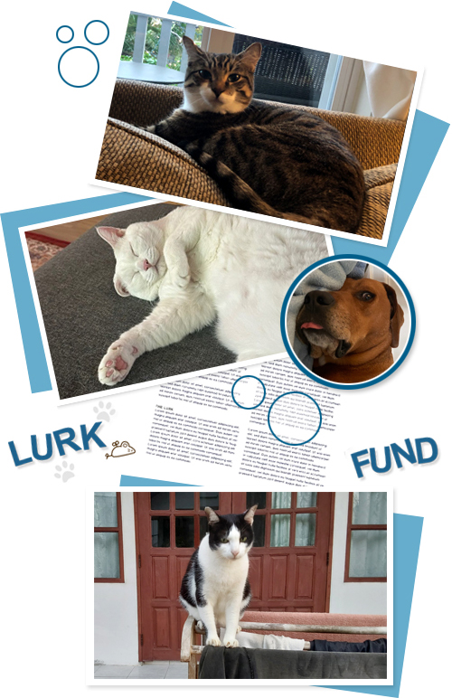 The fund is inspired by a cat named Lurk. Lurk got his name as a kitten by hiding in the house, but peering out of corners, from under chairs or from other hidden locations and leaping out to play. As an adult, Lurk demonstrated the biggest heart ever; never in his life did he act with malice or unkindness, but rather genuinely adored every creature he met.
